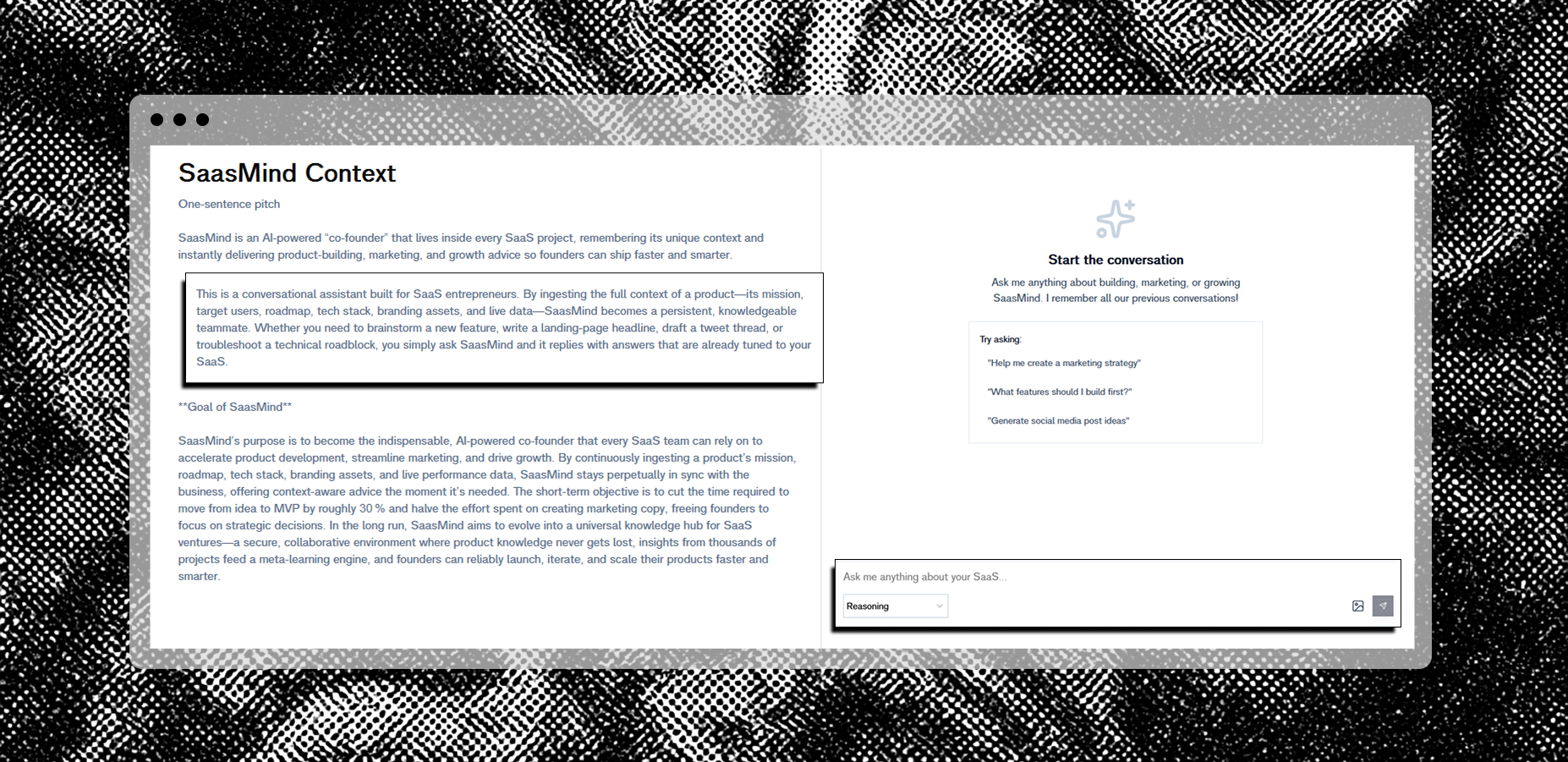 SaaSminder is an AI teammate for SaaS founders. It remembers your product context, drafts landing copy, proposes roadmaps, and helps with marketing, so you ship faster.